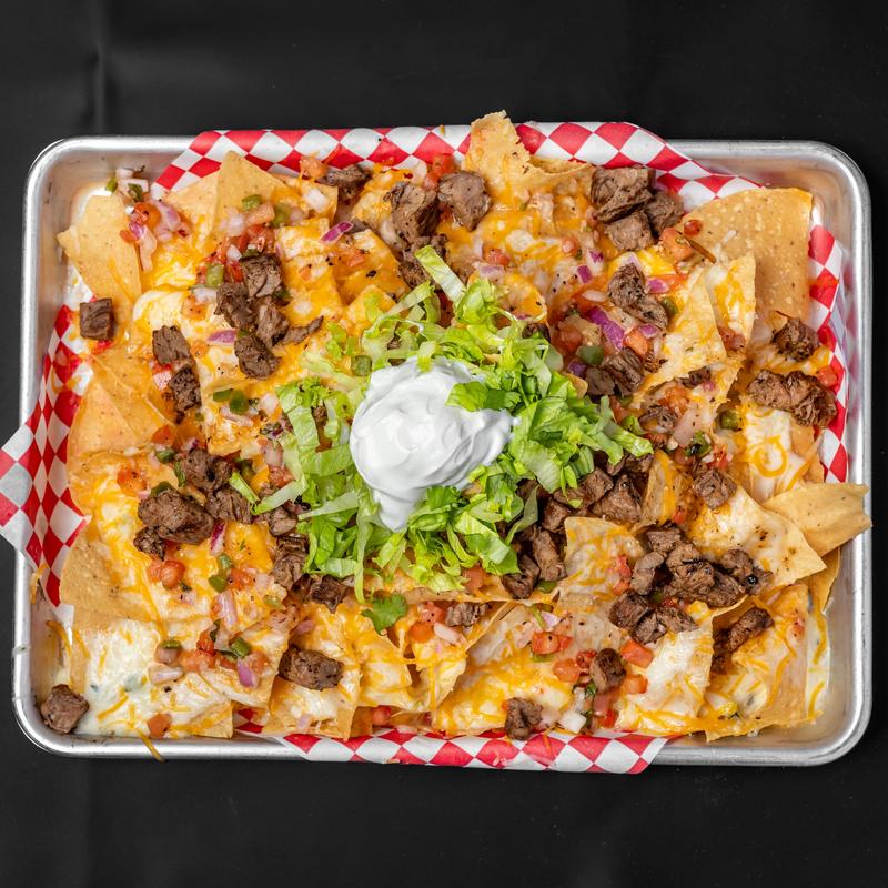 Crisp Chips Topped with Melted Cheddar, Warm Queso, Ranched